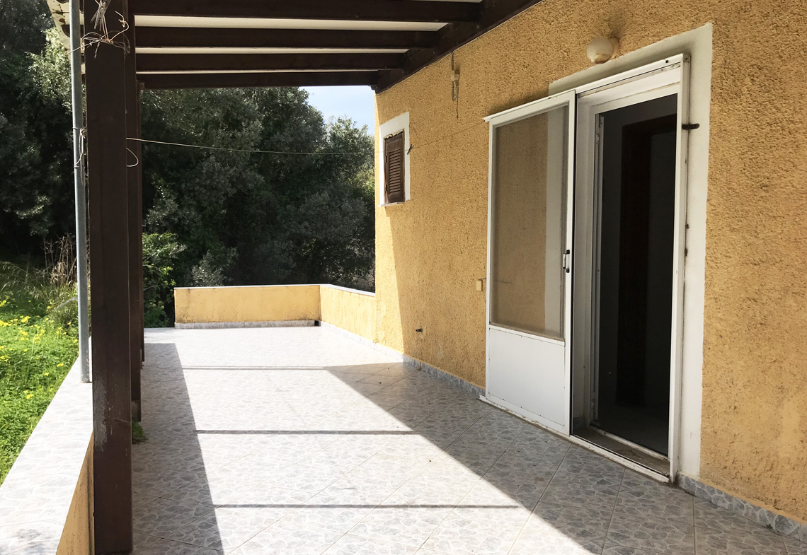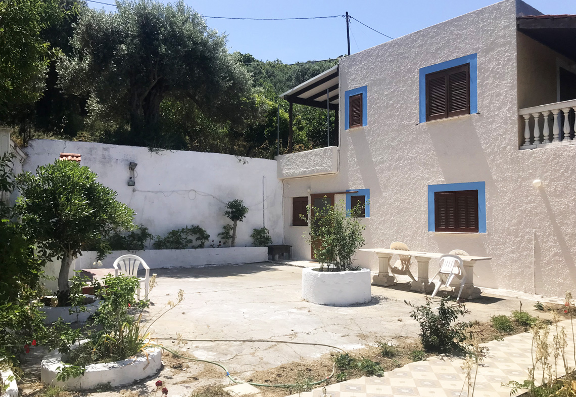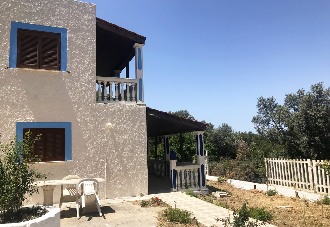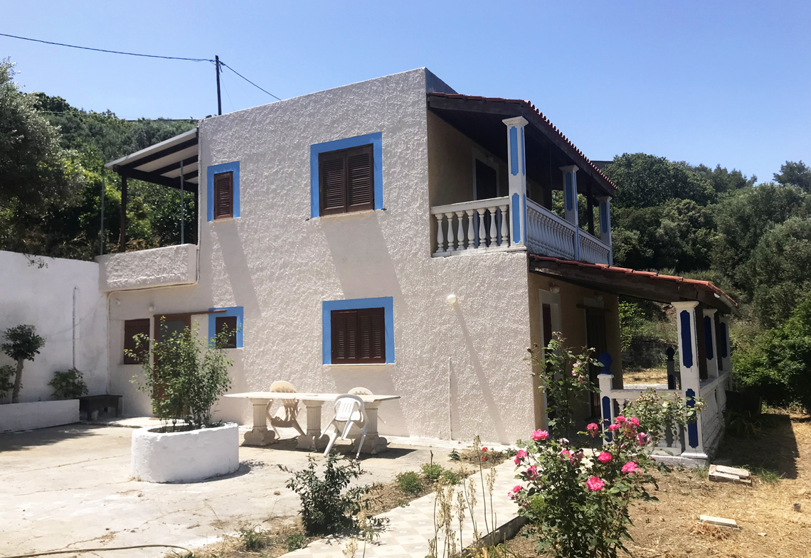 It consists of a courtyard with a garden in front and a garden at the back. On the ground floor inside the house there is a living room, dining room, bathroom, kitchen (with electrical appliances) and a kitchenette in the backyard. On the 1st floor (accessed by an internal wooden staircase) there are 2 bedrooms, a bathroom (fully equipped) and a common balcony with sea views.