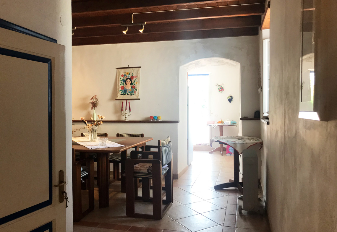 A lovely traditional house in a central location, built on three levels, with a self-sufficient guesthouse on the lower level and the main house above. The main house consists of a living-room, dining room, kitchen, WC, and veranda on the first floor and two bedrooms, a bathroom, balcony and veranda on the top floor. The guest house below has an independent entrance, a single bedroom, a living room, kitchen and bathroom. In addition, there is a patio to the side of the property with a built-in bbq.